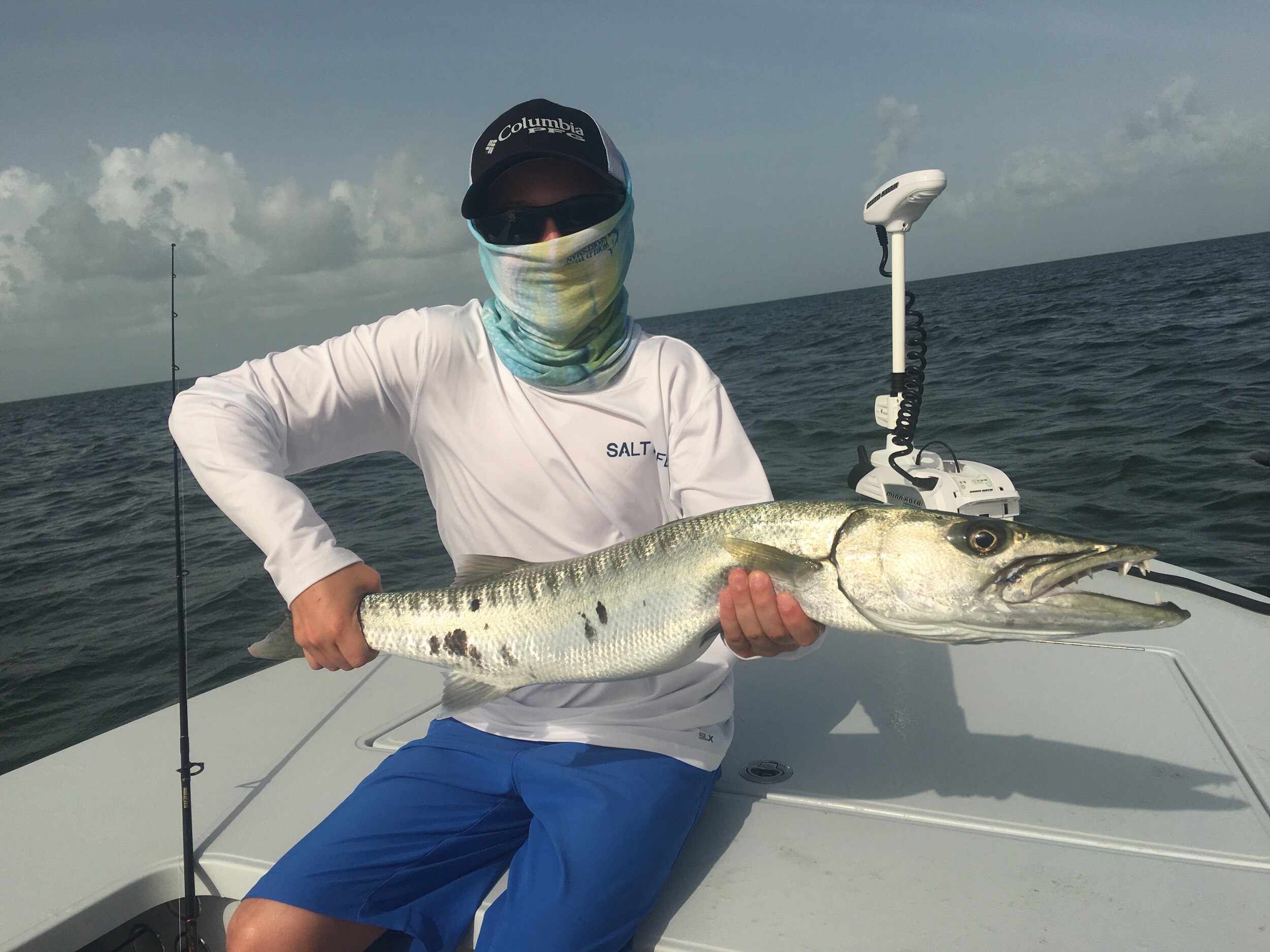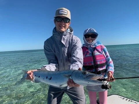 Barracuda fishing in the Florida Keys is flat out awesome! A great fish for anglers of all ages, these often willing to bite predators offer a great fishing experience. Barracuda are abundant on our Florida keys flats year round and offer a fun and exciting fishing opportunities on both bad and good weather days. Both spin and fly anglers can enjoy the rush of watching a monster barracuda suddenly light up and smash their fly or lure. Barracuda are known for explosive bites, long runs and impressive jumps making them one of the most fun fish to target on our Florida Keys flats.